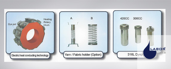 ECO DYER, which is electric heat conducting type laboratory dyeing machine, the advanced heat conduct design offers not only advantages of a Glycerin type dyeing machine, but also provides features of an infrared type dyeing machine, the new design provides improvements on the two conventional designs.